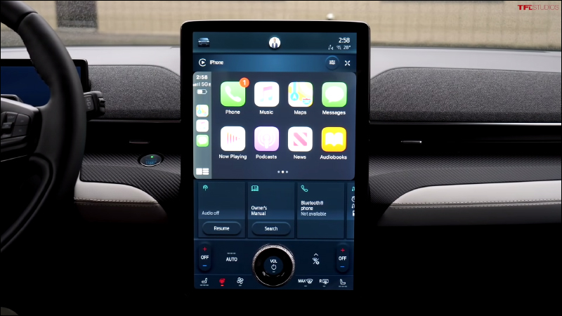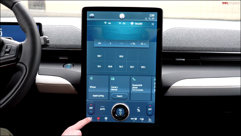 在車內中控台位置, Mach-E 一樣配備了 15.5 吋的大尺寸觸控螢幕,運行福特最新的 SYNC 4A 娛樂系統。不過相比 Model Y 採用橫向螢幕,在 Mach-E 則為直立設計,能透過螢幕控制車輛模式、空調溫度等資訊,同時也在螢幕下方保留一個實體旋鈕可調整音量這類控制設定: