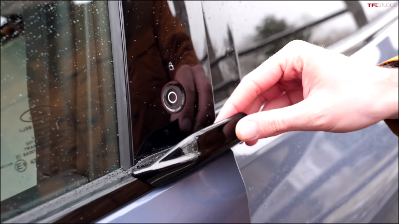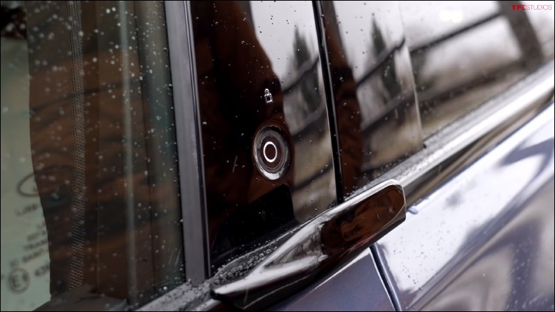 Mach-E 在車門和 Model Y 一樣沒有外露的門把設計,但操作方式則是靠近車門並按下 B柱上的按鈕解除電控車門,有趣的是 Mach-E 前門設有拉動的把手: