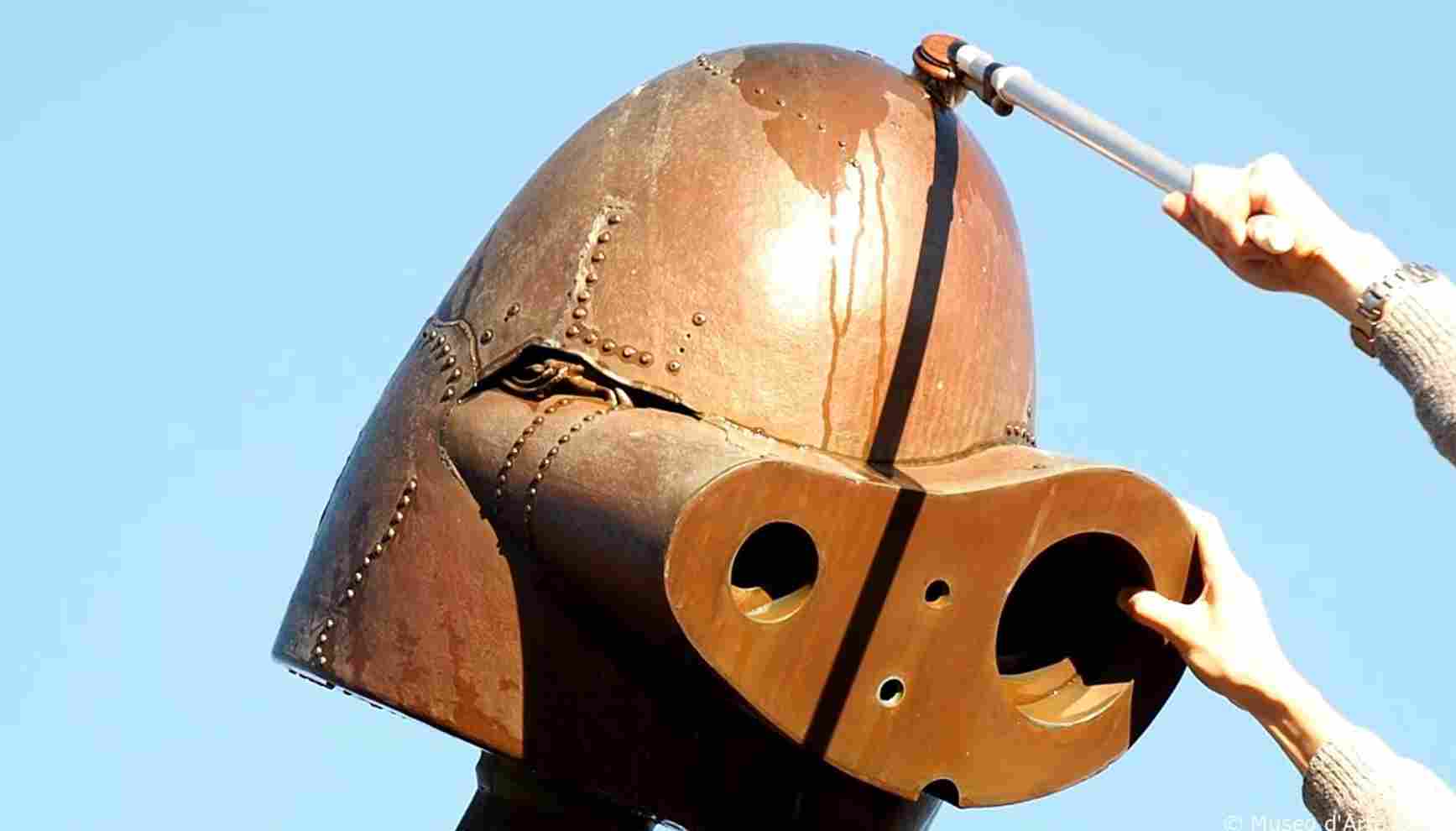 職員從巨神兵的頭盔開始清潔,在陽光映照下,格外療癒、明亮。這部機器人是《天空之城》重要角色,它藏著古老文明的高端科技;王朝沒落後,在城內當值的巨神兵,守護著這個長滿花草的空中島嶼,飛鳥都愛站在它的頭部與肩膀,與島嶼的大自然融為一體。在疫情期間,美術館休館,花園內的花葉亂伸,倒有點《天空之城》的荒涼感。