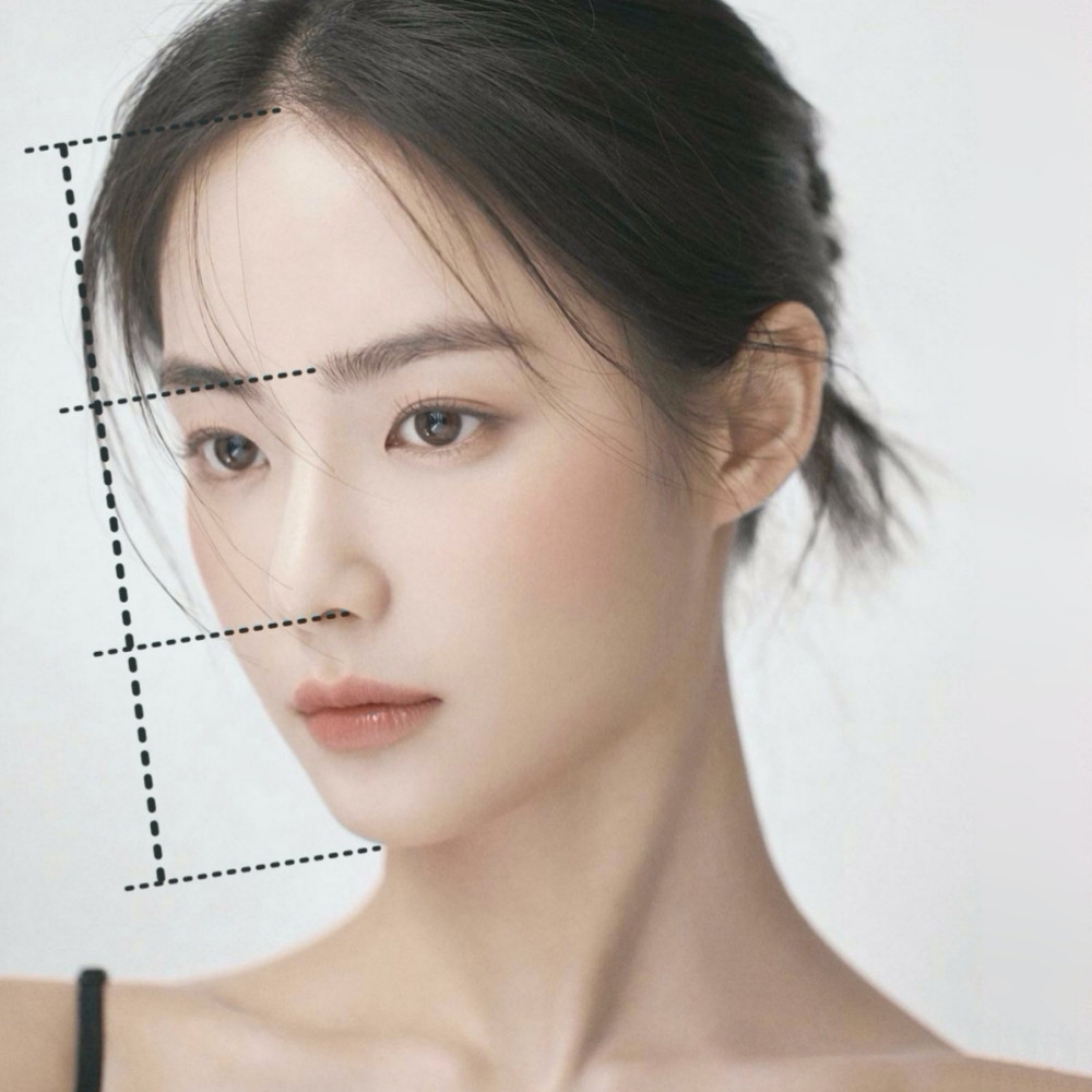 以前常聽到的完美臉型標準是「三庭五眼」,三庭也就是臉長的比例,臉長為上庭1:中庭1:下庭1是以前認為的完美比例,但近年也越來越多整形醫生認為上庭1:中庭1:下庭1.2、也就是下庭稍稍偏長的臉型會更加上鏡,這種臉型其實更偏向鵝蛋臉,是最適合上鏡的小臉,也是很多明星的臉型。