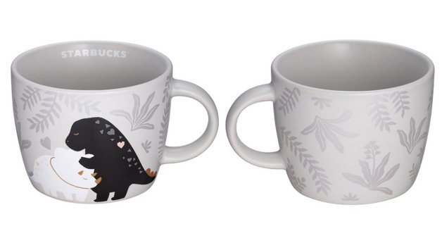 第一款為「初始之戀馬克杯」,底色為純白色,上面有暴龍和三角龍互相依偎著,特別之處在於整個杯身還有使用「銀灰色」的樹葉進行點綴,黑色恐龍身上更隱藏「粉色愛心」呢!
