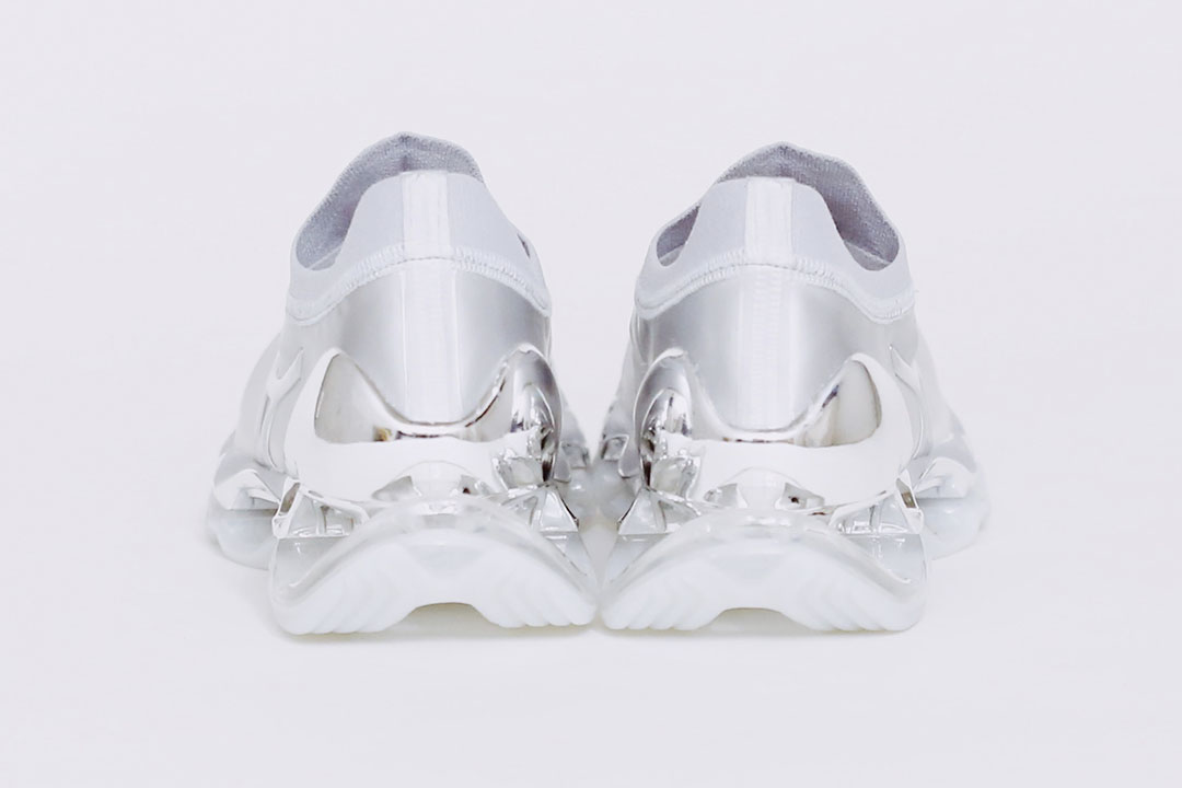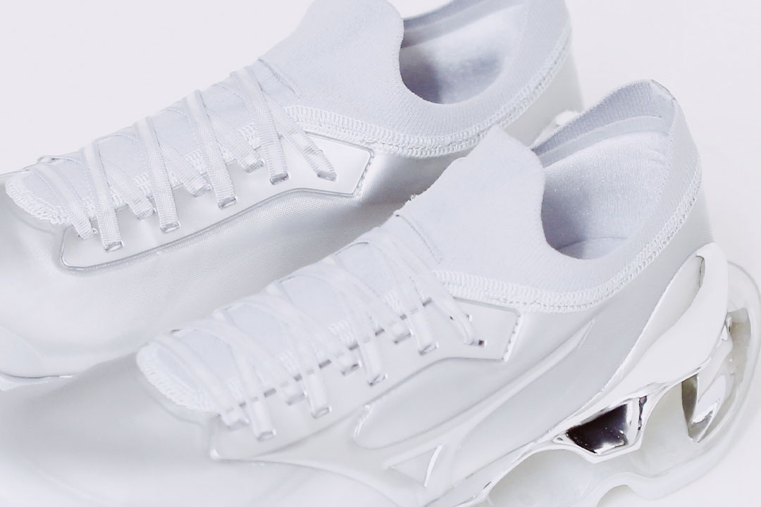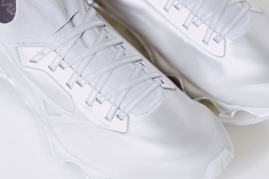 日本有三位以女體情欲藝術聞名全世界的藝術家,其中的空山基(Hajime Sorayama)以金屬質感賦予超現實主義風格自成一格,他的作品被 MoMA、Smithsonian Museum 等指標性博物館收藏,在當代藝術中有無可取代的地位(想了解更多空山基老師可以看先前友站的專訪報導)。而我們熟知空山基並不只因為藝術上創作,與街頭品牌的跨界讓空山基這名字出現在更多地方,甚至走上時裝伸展台上。參與球鞋也不是第一次了,先不論還沒有下文的 Li-Ning 聯名鞋,Dior 2019 秋冬系列就推出 B23 高筒鞋款,但我可以說與 MIZUNO 的攜手更能體現空山基超現實主義美學,尤其光鞋型這點就選得精妙。