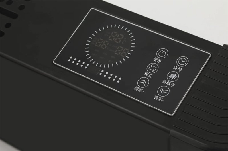 在熱風口的右側則是觸控按鈕與液晶顯示面板的區塊,你可以直接從這裡操作來開關、定時開關機、啟用負離子、切換模式與調節溫度等,不過這款新產品當然也不是只能從此操作,後面筆者會講到其他的遠端控制方式。MIZAI 暖霸石墨烯智慧瞬暖器總共有三段設定,分別為: