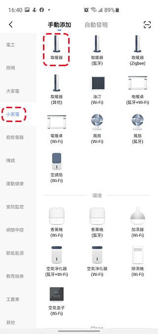 - 下載安裝好後,開啟應用程式,註冊一個新帳號並登入。接著點選應用程式中的「添加設備」,或是右上角的「+」號。從小家電裡面選擇「取暖器」。