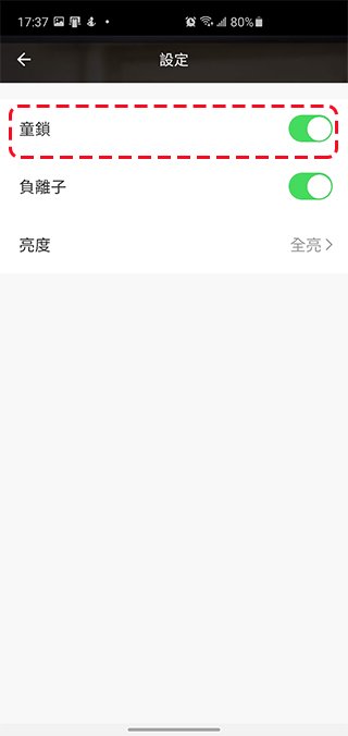 從倒計時功能裡面設定短時間使用的倒數關機時間,而在設定這一項裡面可以開關兒童鎖、負離子,或是調整與關閉面板亮度。