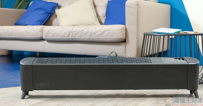MIZAI 暖霸石墨烯智慧瞬暖器機身瘦長,含腳架高度約 17.5 公分,長度約 100 公分,深度約 11 公分,這種非常少見的瘦長型的設計不僅加大了冷空氣進氣口與暖空氣送出口,更適合放置在地上狹長空間,像是床尾、窗邊、牆邊,或是拆下腳架利用機體後方預留的壁掛孔固定在牆上。