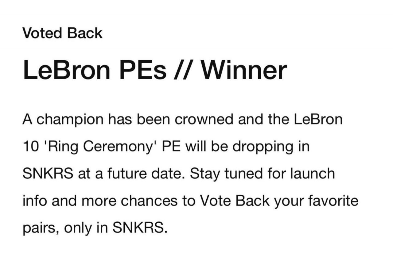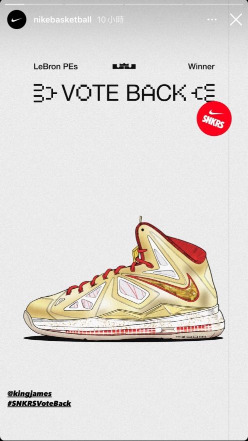 為慶祝 LeBron James 生涯第四度拿下 NBA 總冠軍及 Finals MVP,幾周前 Nike SNKRS App 舉辦 LeBron PEs Vote Back 投票,從歷代 PE 當中挑出 16 雙進行人氣對決,最終勝出的款式就會公開發售。經過四輪投票後稍早 Nike Basketball 公布結果,LeBron X ‘Ring Ceremony’ PE 連贏四關成為冠軍,這歷程就像是 NBA 隊伍得在季後賽贏下四個系列賽才能奪冠封王。