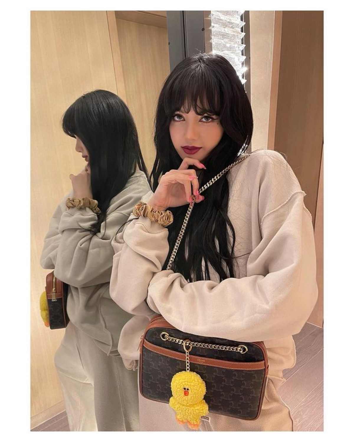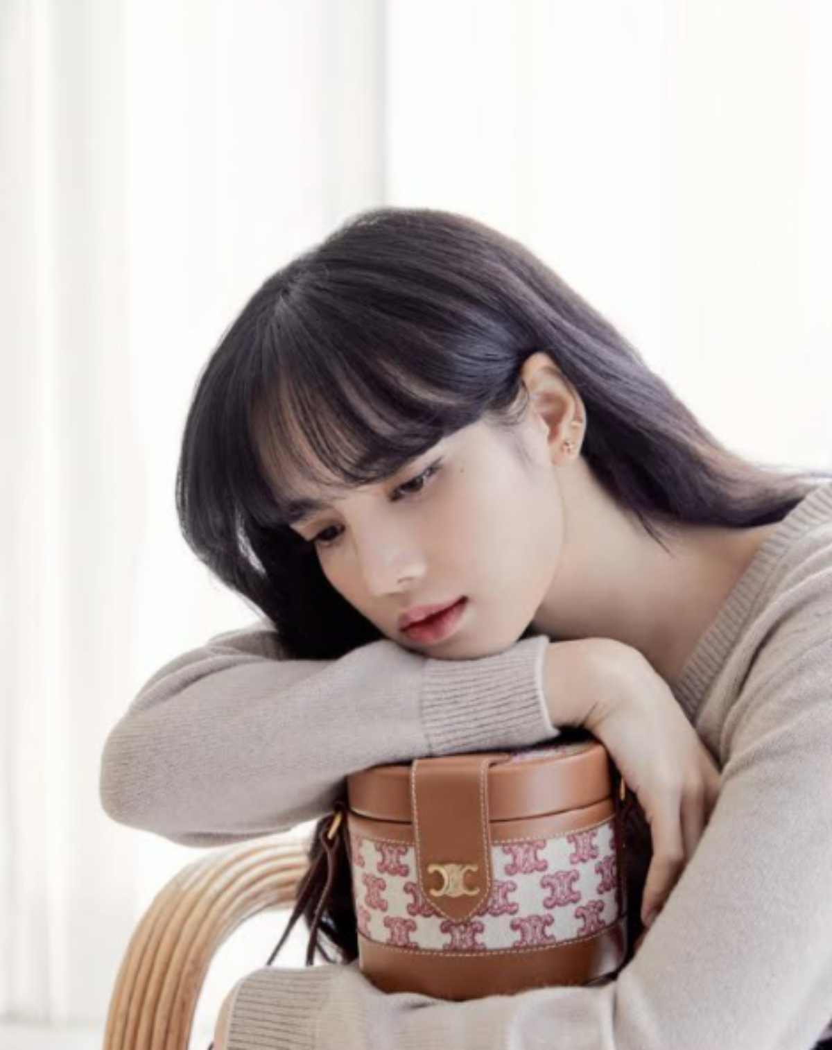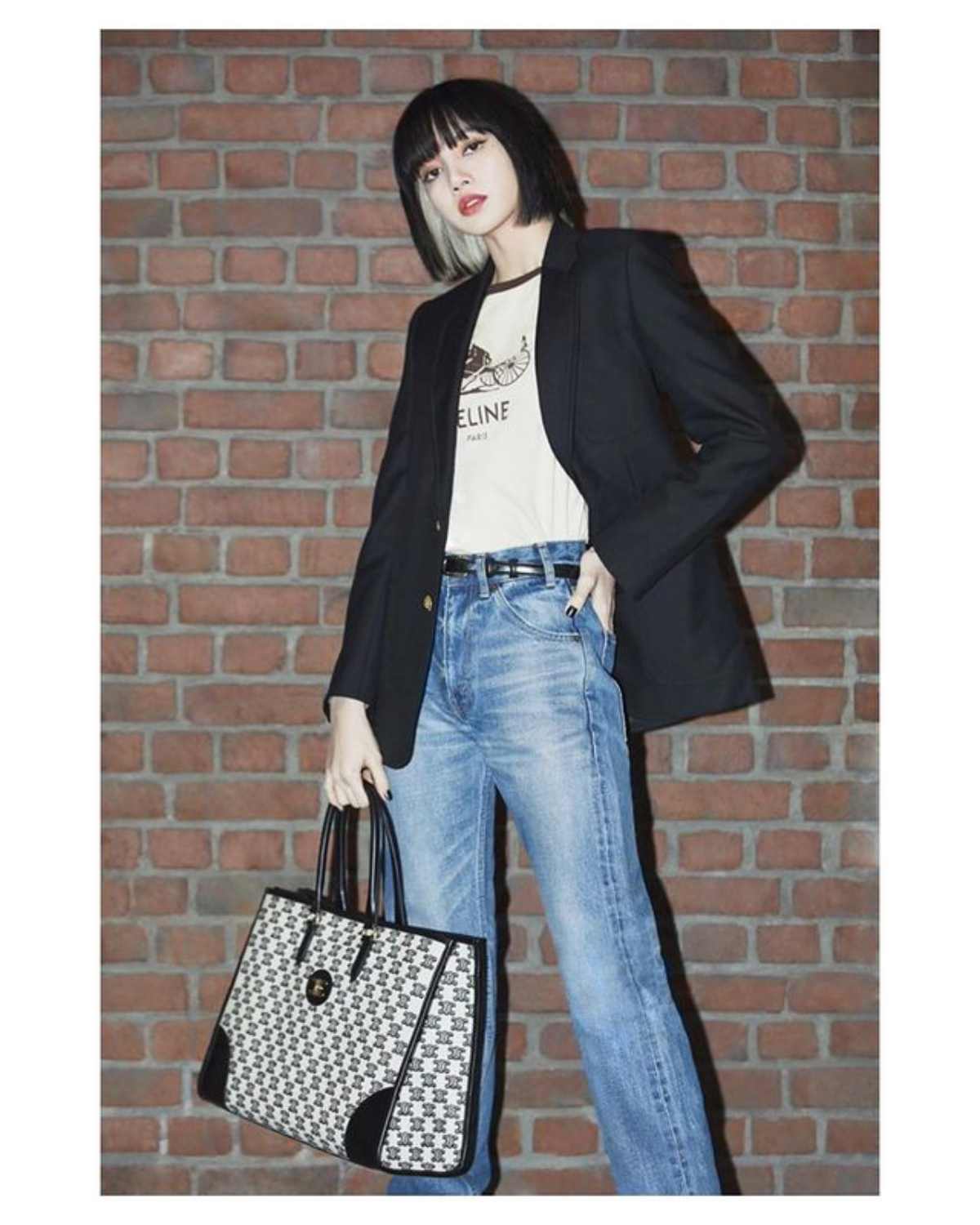 再次搶先曬出新包款的LISA,這次揹上了CELINE最新的老花帆布印花包,方中帶圓的復古包型,小牛皮革包邊搭配上金色鏈袋,可調整成肩揹或斜背兩種不同揹法,容量很適合日常上班使用。