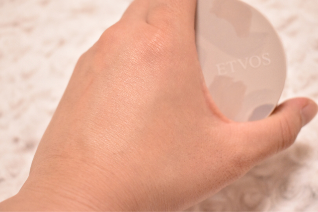 我先試擦在手上,為大家展現粉體的光澤感!我將蜜粉拍在食指下方的位置,可以看出膚色變亮,並散發些微光澤。我是乾性膚質,冬天時肌膚容易乾燥脫屑,所以不常使用蜜粉,不過這款蜜粉不會讓肌膚掉屑,反而讓膚質看起來更加細緻美麗,真不愧是ETVOS推出的產品!