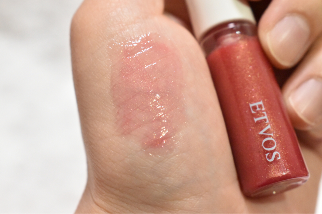 試著擦在手上,可以看出色澤輕透的唇彩中帶有亮粉的點點光輝。如果妳的唇色較深,單擦應該就非常好看了!此外,這款唇彩跟紅棕色的唇膏很搭,非常適合秋冬妝容喔!