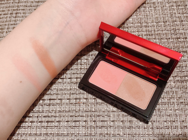 這款商品是腮紅&眼影兩用彩妝盤。左邊是霧面雛菊粉,右邊則是加入細緻亮粉的光澤肉桂棕,兩款都非常顯色。此款商品有附贈專用刷具,刷毛的質感柔和舒適,很難相信它只是附屬的贈品!