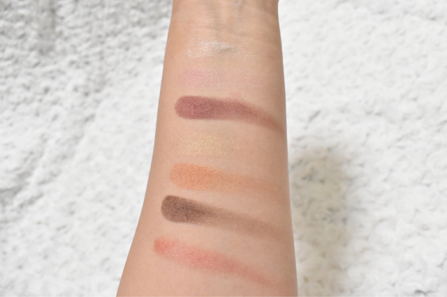 下圖是將彩妝擦在手上的感覺。用來打底的眼影含有亮粉成分,散發美麗光澤,讓眼妝流露出自然卻奢華的氣息,能夠吸引目光。其他色號也非常顯色,直接用手塗抹,就能畫出深邃立體的眼妝。用刷具上妝的話,則會多一份柔和甜美的感覺。這幾色眼影並無添加亮粉,而是呈現近似珠光的亮澤感,不管是直接搭配彩妝盤內的打底眼影,還是選擇自己愛用的亮粉眼影,妝效都很不錯喔!