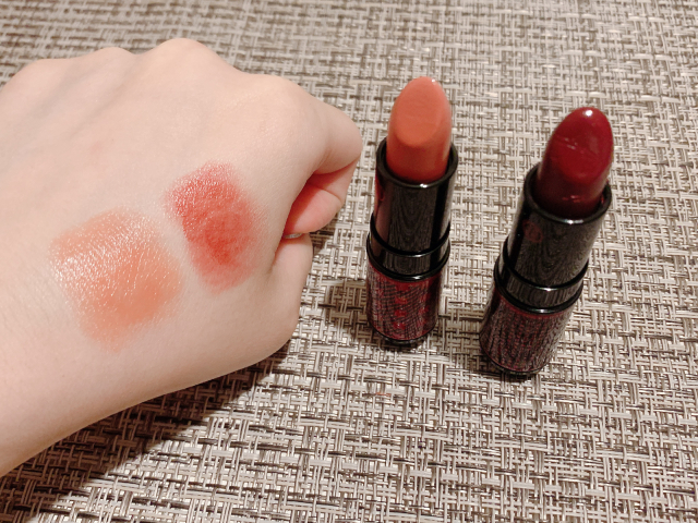 左邊是玫瑰米色,右邊是黑醋栗紅。玫瑰米色是以粉紅色為基底的米色系唇膏,適合搭配成熟穩重的妝容,或是上班、上課時的自然感妝容,是非常萬用的顏色。黑醋栗紅的色澤中略帶清透的藍色,能加強肌膚的透明感,讓妝容更具存在感。兩種唇膏都使用天然色素製成,不會使嘴唇乾裂脫皮,對於肌膚敏感的我來說,是非常好用的唇膏!