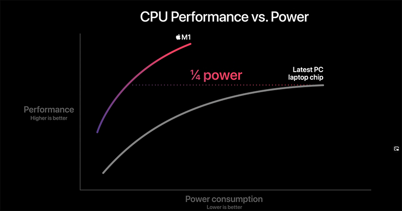 ▲圖:M1 晶片與同級 PC 相比僅需 1/4 的能耗,實際?(來源:Apple)