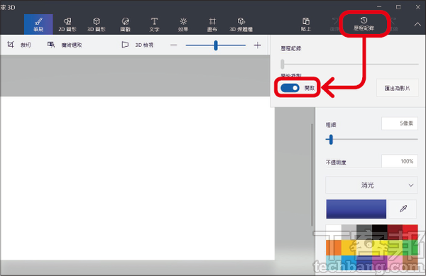 步驟3.開啟新檔案後,首先點選上方工具列右邊的「歷程記錄」圖示,接著將「開始記錄」選項進行啟動。