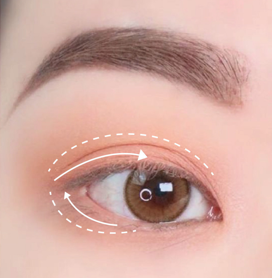 要讓眼妝完整又精緻,臥蠶、眼線、睫毛膏缺一不可!我們將眼睛稍為瞇笑起來,同時用斜角刷沾取紅棕調的陰影色(或是直接用眉筆),在「臥蠶上方1mm」的位置畫出陰影線。