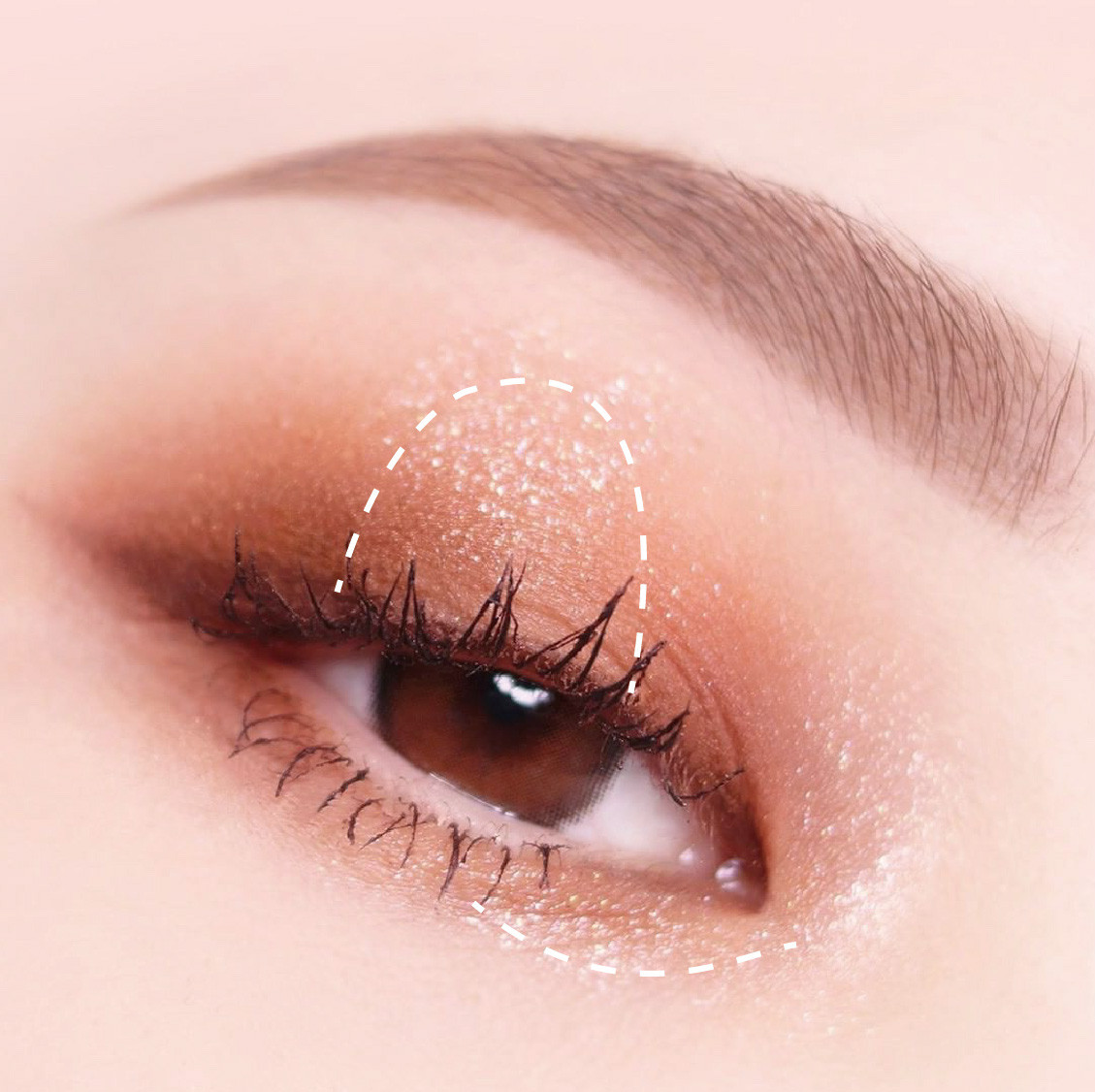 先用指腹沾取提亮色,輕點在眼球上方(眼皮中央),再用錐形眼影刷沾取同款提亮色,幫眼頭與臥蠶提亮。如果覺得上述步驟的顏色暈染的不夠自然,可以再準備一支「乾淨的鬆毛眼影刷」,稍微過度一下眼妝邊緣。這樣的眼妝基本上就畫完七成囉!
