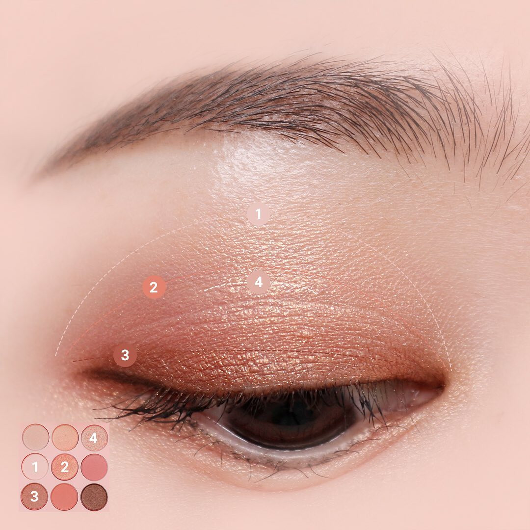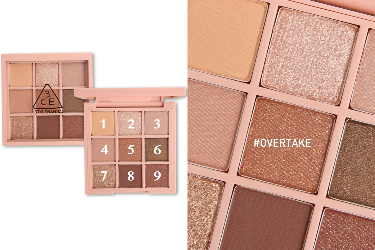 以3CE經典的九宮格眼影盤#OVERTAKE為例,1&3是打底色;4&5是主色;6&8&9是加深色,2&7則是提亮色。顏色定位好後,能更方便我們變化出不同的眼影公式。