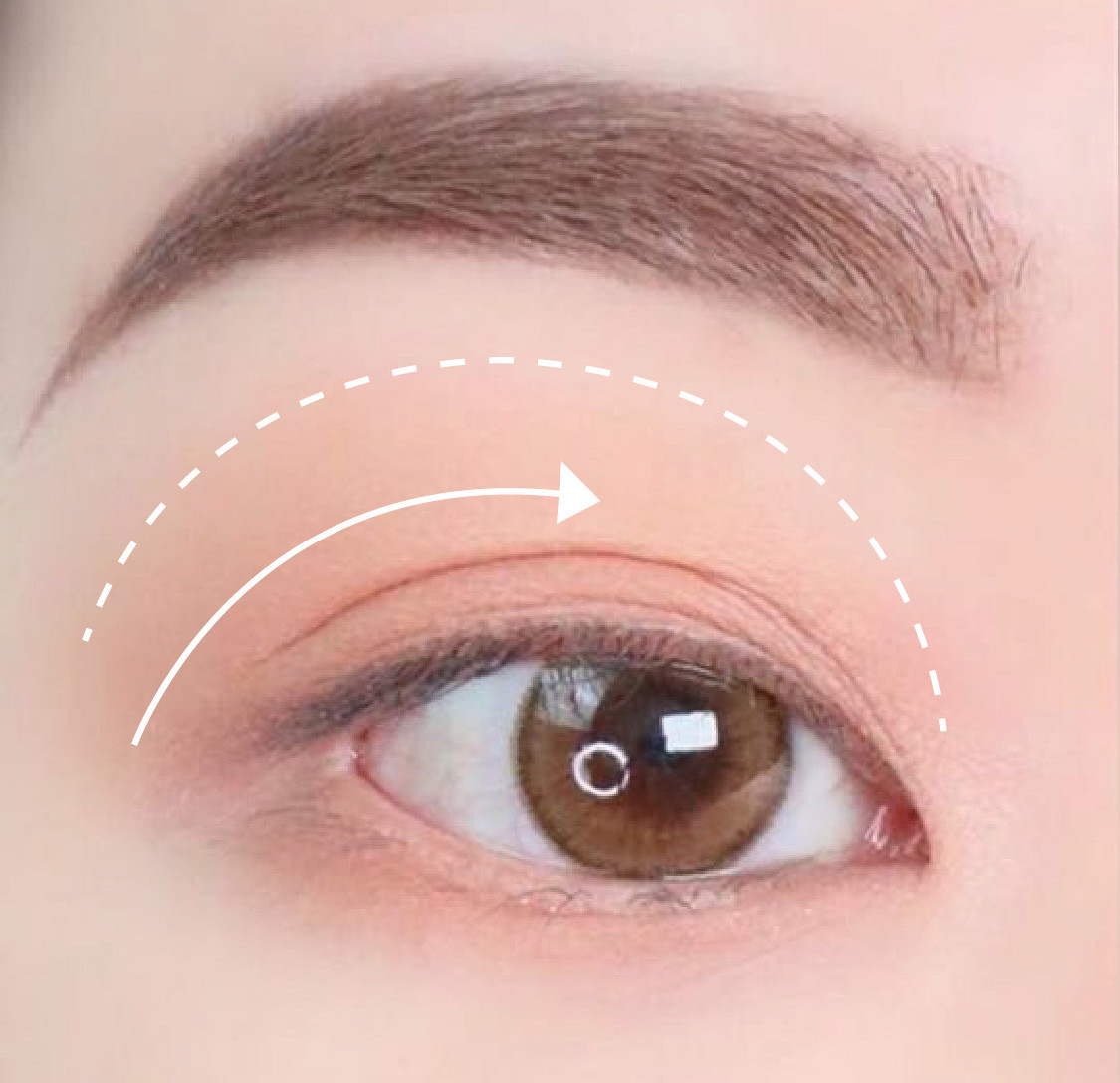 我們使用暈染刷、沾取有消腫效果的霧面打底色,從眼尾往眼頭暈染;高度不超過眼窩。直到眼影刷上幾乎沒有打底色後,才做前後來回的暈染,改善色塊感。