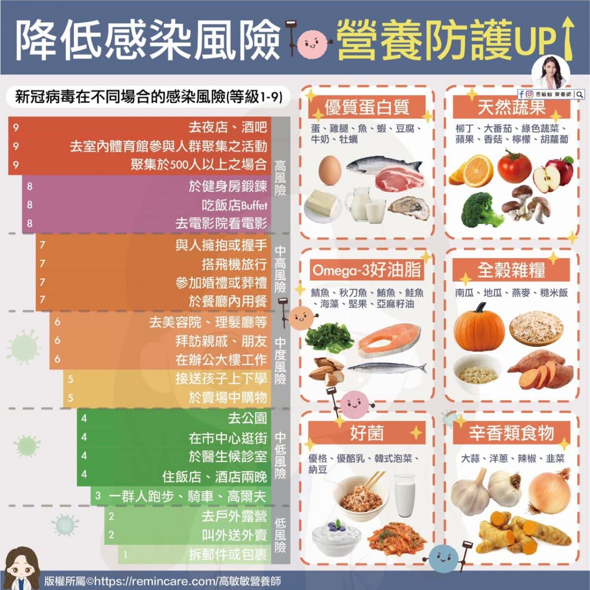 全球新冠肺炎確診人數已突破一億,目前有215萬人死亡;台灣防疫近期也正面臨嚴峻考驗。除寄望防疫人員,更要先學會保護自己。營養師高敏敏在社群上分享了「新冠病毒在不同場合的感染風險」與「6大關鍵營養食物提升免疫力」,非常時期,建議大家少到感染風險高的地方,並從飲食方面增強免疫力,一起度過疫情難關!