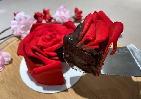 蛋糕上精緻擬真的花瓣是由蛋糕職人在BAC經典巧克力蛋糕上,層層綴上手工製作的鮮紅色巧克力玫瑰花瓣,細心捏塑真花綻放嬌豔欲滴的模樣,費時費工創造出仿真玫瑰花蛋糕,最能代表戀人滿滿的愛與心意!