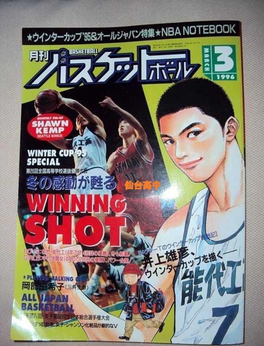 其中,漫畫中經典的湘北高中對上山王工業的情節,正是特刊上的兩支封面球隊~仙台高中(宮城)對上能代工業(秋田)! 仙台高中在上半場大幅落後但下半場奮起直追,最後以一分輸給能代工業(漫畫是湘北以一分贏了山王)。雖然湘北高中的原型是武藏野北高中(東京),但武藏野北高中從未進入全國大賽中,湘北高中進全國大賽的原型是參考身穿紅色球衣的仙台高中是眾多井粉所認同的。