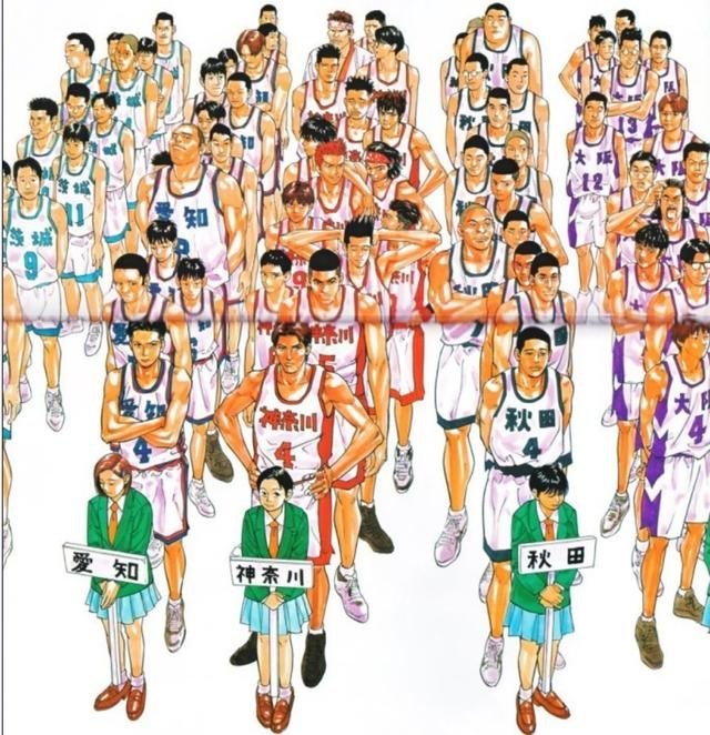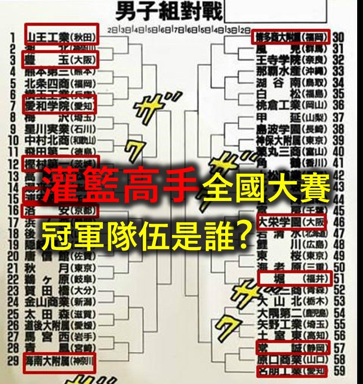 《灌籃高手》全國大賽共有59隊參與,其中愛和學院、海南大附屬、山王工業、洛安、博多商大附屬是種子強對,加上湘北、大榮、名朋、常誠 ..都是熱門的強隊。
