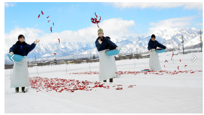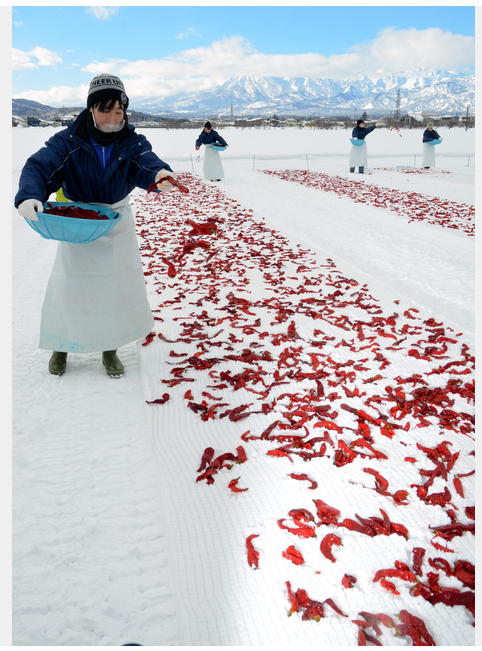 日本新潟縣妙高市位在高原地形,每到冬天就會進行「かんずり」的醃製。「かんずり」是一種在地傳統辣椒醬,今年20號「大寒」最冷的一天,在雪地撒上陸續撒滿紅色辣椒,至2月底為止會有共3噸的辣椒在雪地上進行初步的加工。會在面積共約1.8mx20m的雪地上晒曝鹽醃過的辣椒3~4天,據說這個製程結束後辣味會変成柔和,完成後再混合酒麯和柚子,發酵3年就是妙高市的在地美味了。前幾年因為氣候變化適合曝辣椒的地方不好找,不過今年因為疫情的關係產量也只剩原來的1/5~1/3。這裡看更多。猜你喜歡一分鐘講堂:台灣大寬頻 HomeSecurity AI居家防護,連假出門最安心滑鼠與觸控板的完美結合,CheerPod 智慧滑鼠超越你的想像查看原始文章商品推薦$672泰式/蒜香/麻辣三味蝦(250g/盒)-任選松果購物 │ 買不完的生活好物購物賺點$399【香料獵人+Coombs Family Farms】楓糖薑母茶組合蝦皮商城購物賺點$556【稑珍】金鑽鹹蛋黃天婦羅海苔 35gx6包入東森購物購物賺點$49【現貨】居家家國潮喜慶中國結牛年新年室內布置裝飾掛件春節2021過年掛飾 財神掛飾蝦皮商城購物賺點$399【MACKIE’S 美吉滋】洋芋片 150gx3包 (甜辣椒 波浪厚切片 )遠傳friDay購物購物賺點$599〝☆元氣小舖☆〞S0408復古波點鋼圈四件套比基尼泳衣泳裝,直購599元,現+預7-10Yahoo奇摩拍賣購物賺點$1,119香茉 藝人Mei 邱馨葦FB直播強力推薦 天使飛翼蕾絲裸感無痕內衣Chanmode4件組蝦皮商城購物賺點$25【ARMYGO】中華民國國旗 小胸針 / 別針Yahoo奇摩拍賣購物賺點$3,080Nike Wmns Ryz 365 Trainers 米白 增高鞋 女鞋 孫芸芸著用 BQ4153-100 DOT聚點蝦皮商城購物賺點$578壓縮腿套男女跑步護具騎行運動馬拉松壓力護腿小腿腿套 健身襪 運動襪 腿套 護具Yahoo奇摩拍賣購物賺點$4,400偽素顏霧光底妝組植村秀官網購物賺點$55印尼 MAITRI Instant Noodle 素食泡麵 85g 組合包(5入)遠傳friDay購物購物賺點$255關於機師 2:飛行員的日子原來這樣過[二手書_良好]8960蝦皮商城購物賺點$250瑞穗鮮奶沐浴皂 牛奶皂 沐浴皂 100g 冷皂 花蓮製造 印象花蓮蝦皮商城購物賺點$200健康本味 韓國香醇養生蜂蜜柚子茶[KR334191]蝦皮商城購物賺點相關搜尋辣椒辣椒醬柚子中國大陸插頭MP3 CD隨身聽CD 香水