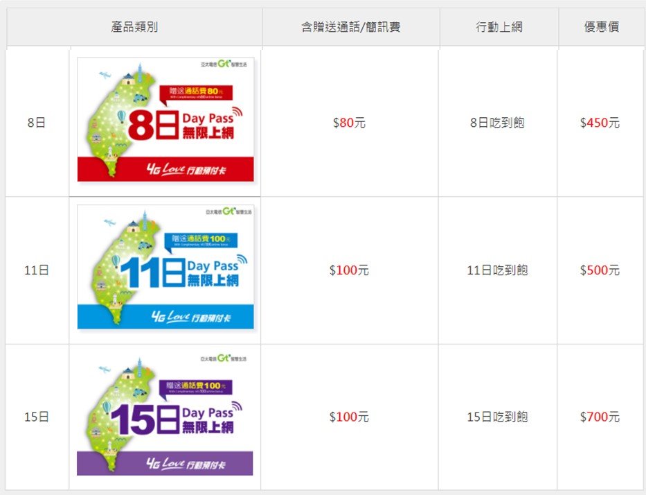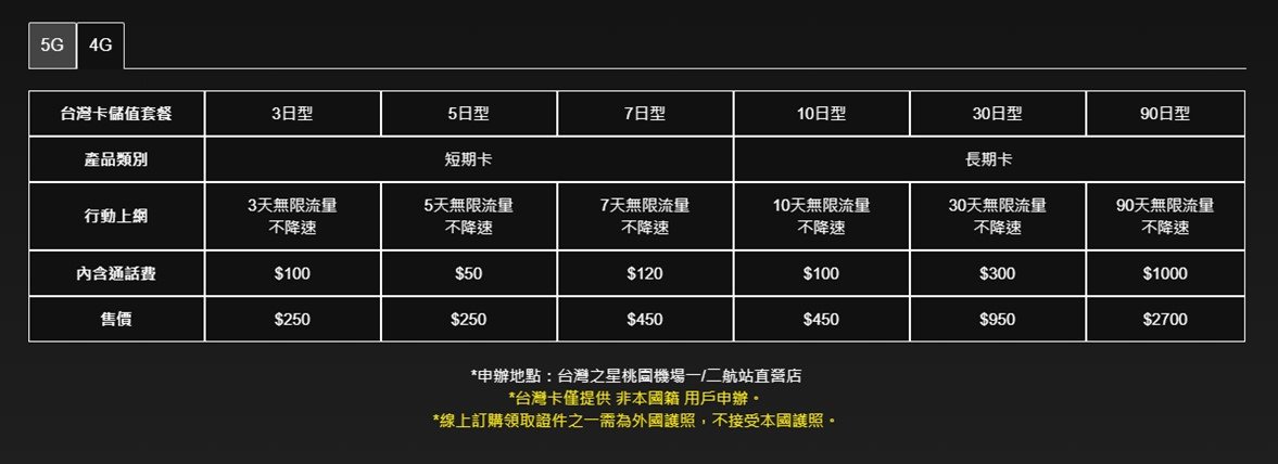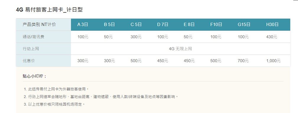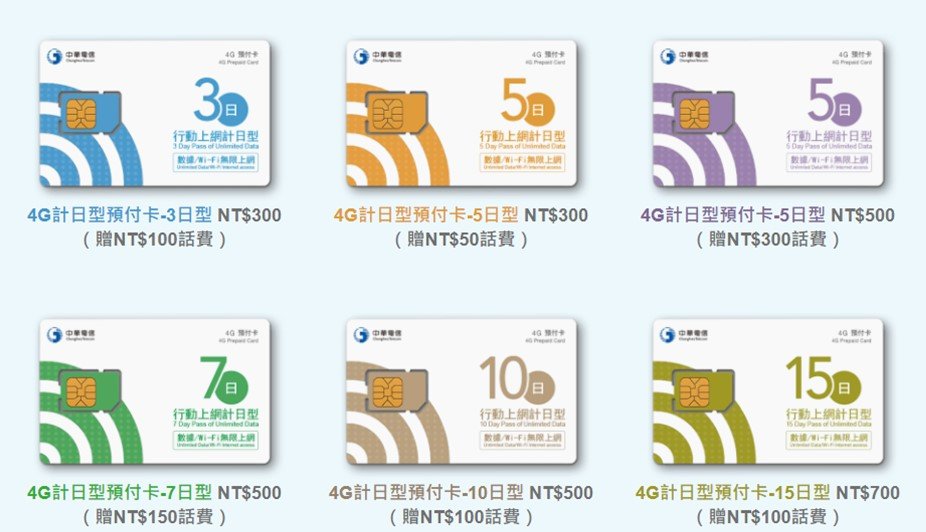 中華電信在台灣各大旅台機場門市有販售4G計日型預付卡,依天數價格$300~$700不等,詳見”中華電信官網” 。