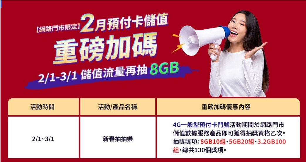 另外,中華電信2月正在做預付卡儲值抽獎活動,可以碰碰運氣。