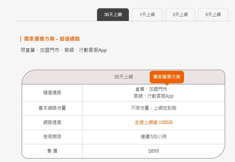 若仍有不足,可以利用「獨家優惠儲值方案」,30天100GB,售價$899!