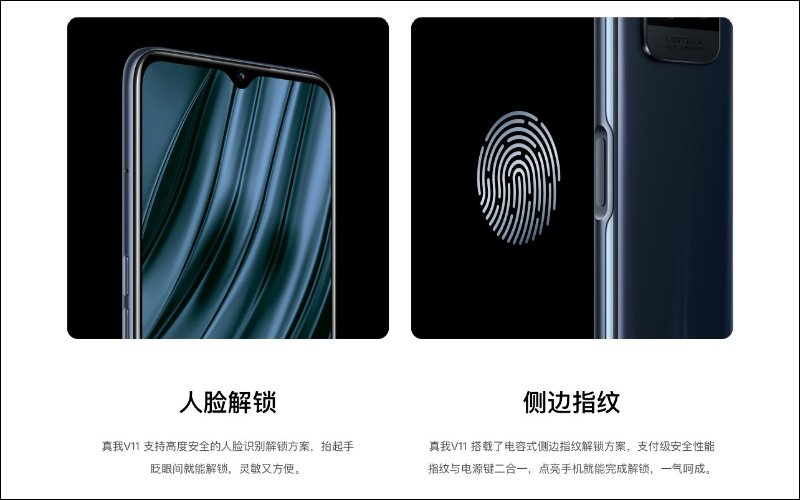 生物辨識部分, realme V11 則支持人臉辨識和結合電源鍵的電容式側邊指紋辨識: