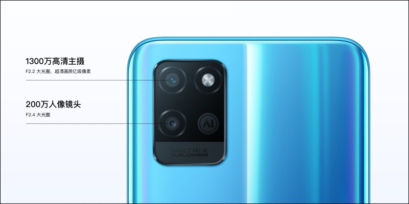 realme V11 相機搭載 1300 萬像素雙鏡頭主相機,分別為 1300 萬像素主鏡頭和 200 萬像素人像鏡頭的搭配: