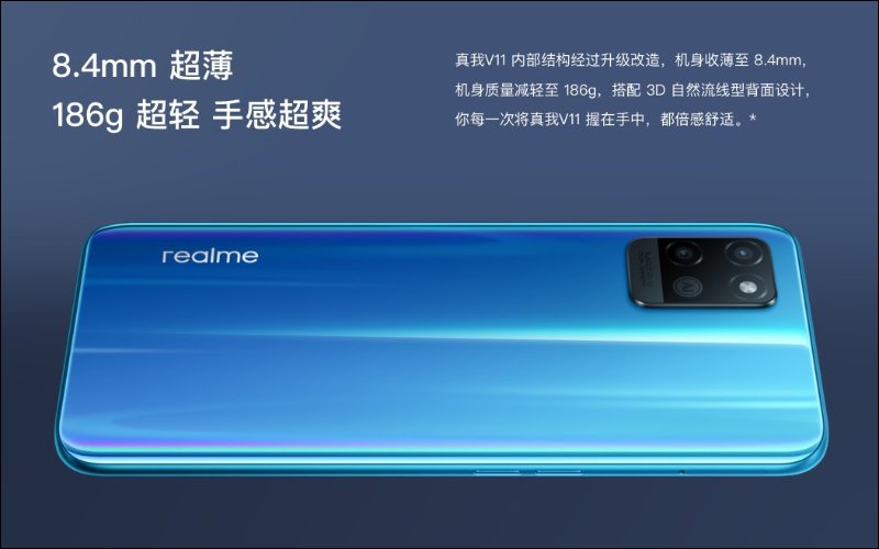 即便內建 5000mAh 的大容量電池, realme V11 內部結構經過設計後將機身厚度控制在 8.4mm 、機身重量也僅有 186g :