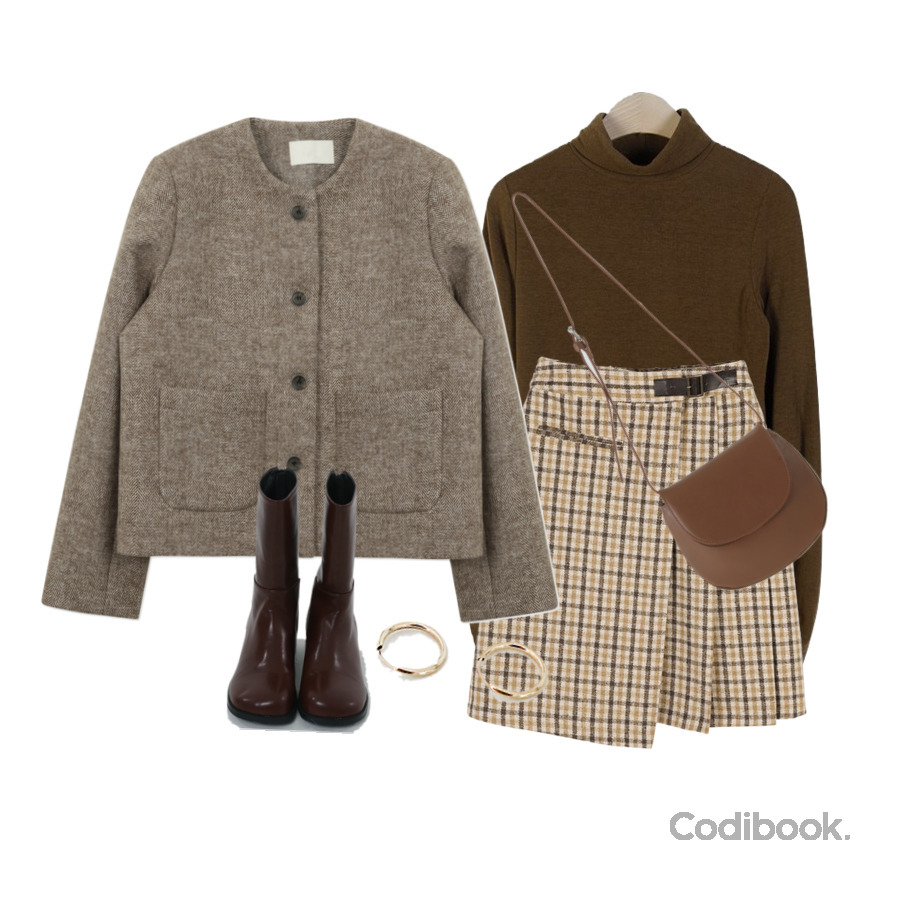 過年期間免不了要拜訪一下長輩與親戚,這時候咖啡色系的穿搭就很適合,沈穩同色調的開襟衫與高領上衣,柔和的材質與版型,配上稍微有點變化的格紋不規則裙擺短裙,以及亮面皮的短靴,立刻為穿搭增添了活潑感!