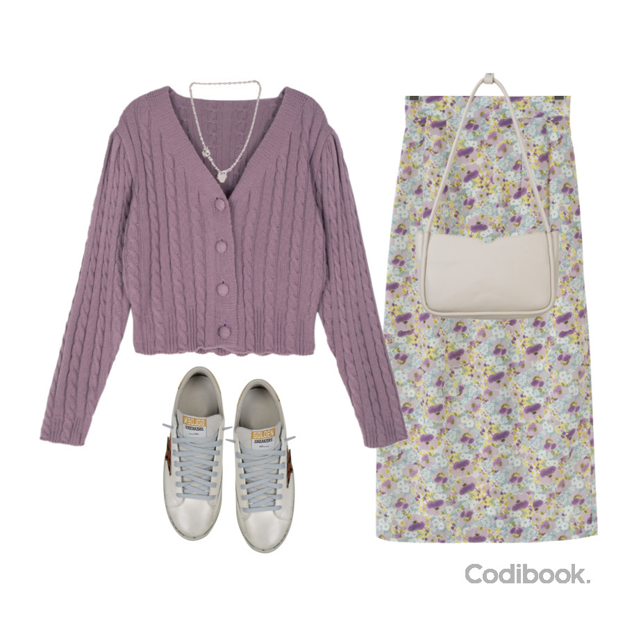 低彩度戴灰調的紫色針織毛衣,即使熬夜蠟黃肌也能安心服用!甜美的中碎花長裙加上休閒鞋,拍照好看又不怕走久會累