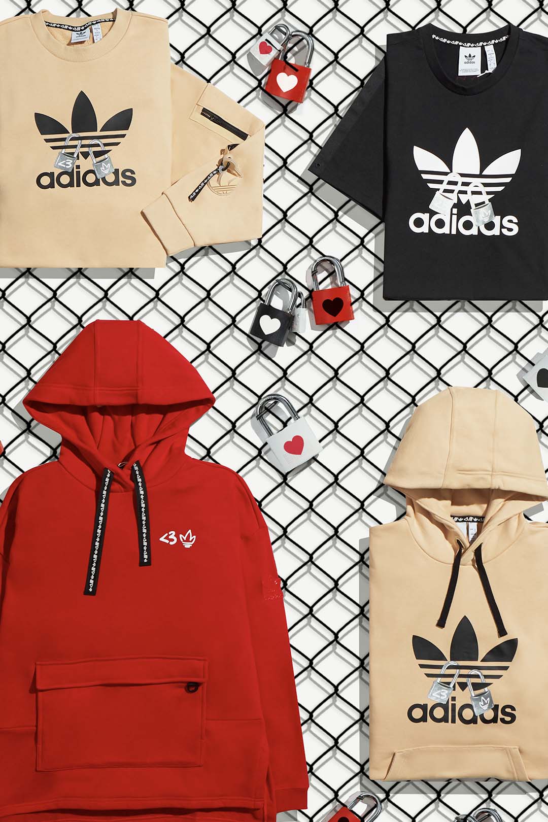 情人節系列服裝則以黑、白、紅為主要色調,以表情符號玩轉經典愛心圖案,展現潮流原創態度。除了將愛情鎖頭套在經典三葉草 logo 上外,更以大口袋、吊環點綴為設計增添個性,打造風格約會 look。adidas Originals 情人節系列即日起上市,詳細販售訊息請密切關注官方粉絲團與 Instagram 查詢。