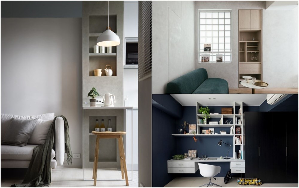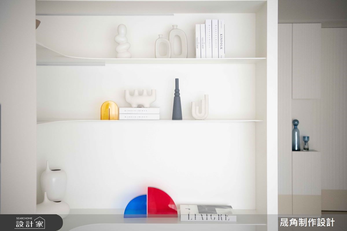在寧靜的住宅空間中,壁面喜歡以淺白、大地色系奠定安定的生活感,此時運用壁龕設計概念打造出一體成型的開放收納架,讓內凹於牆面的框格替牆面帶來不一樣的層次,又能在大面積的開放櫃設計中,保留空間原有的一致感。而最初用於擺放神像的壁龕,其實具有節省空間的作用,國外的居家設計中,經常應用於衛浴空間的設計,提供淋浴所需瓶罐的擺放。