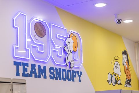 相比台南店的棒球風格,高雄主題店多了一種復古感,銀色的背景和史努比角色們的頭像十足可愛!另外還有一面高達300公分以上超壯觀的大型史努比LED牆,讓人還沒進門就已經掉入花生漫畫的夢幻陷阱,手機的快門聲響不停(笑)