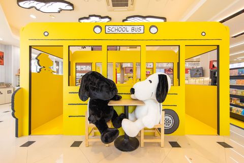 進門後就可以看到休憩區改造成經典的史努比黃色巴士校車!椅背採用史努比與他的好朋友們一起呈現,讓粉絲坐在裡面就像是真的坐在校車內,沒想到在7-11坐坐也可以湧現各種童年回憶~