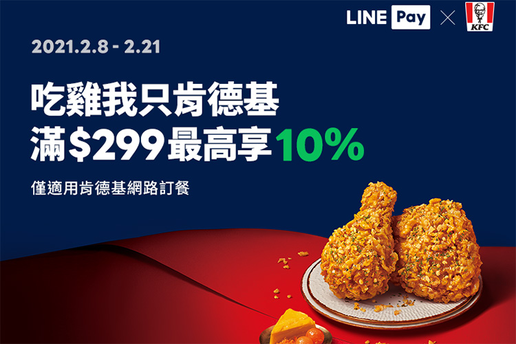 活動期間內,已註冊LINE Pay的用戶於肯德基線上訂餐消費,結帳時透過LINE Pay付款且單筆實際付款金額滿NT$299元(LINE POINTS點數折抵金額不計入),可享以下優惠: