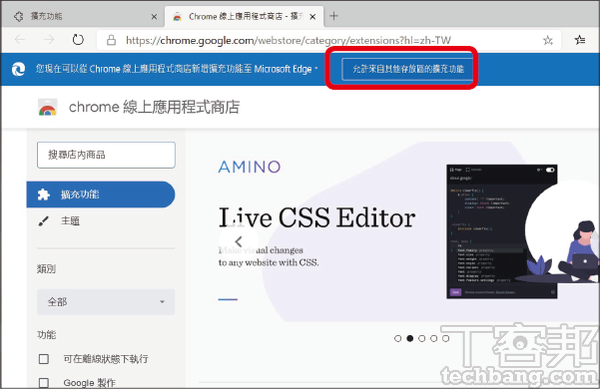 步驟3.若是至 Google 開設的 Chrome 線上應用程式商店,則記得要先點選上方藍色的「允許來自其他存放區的擴充功能」按鈕,接著才能進行安裝。