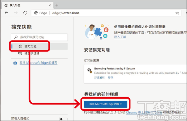 步驟1.點開 Edge 主選單找到「擴充功能」選項,此處會顯示瀏覽器目前所安裝跟啟用的擴充功能,點一下藍色按鈕就會跳轉至微軟開設的商店。