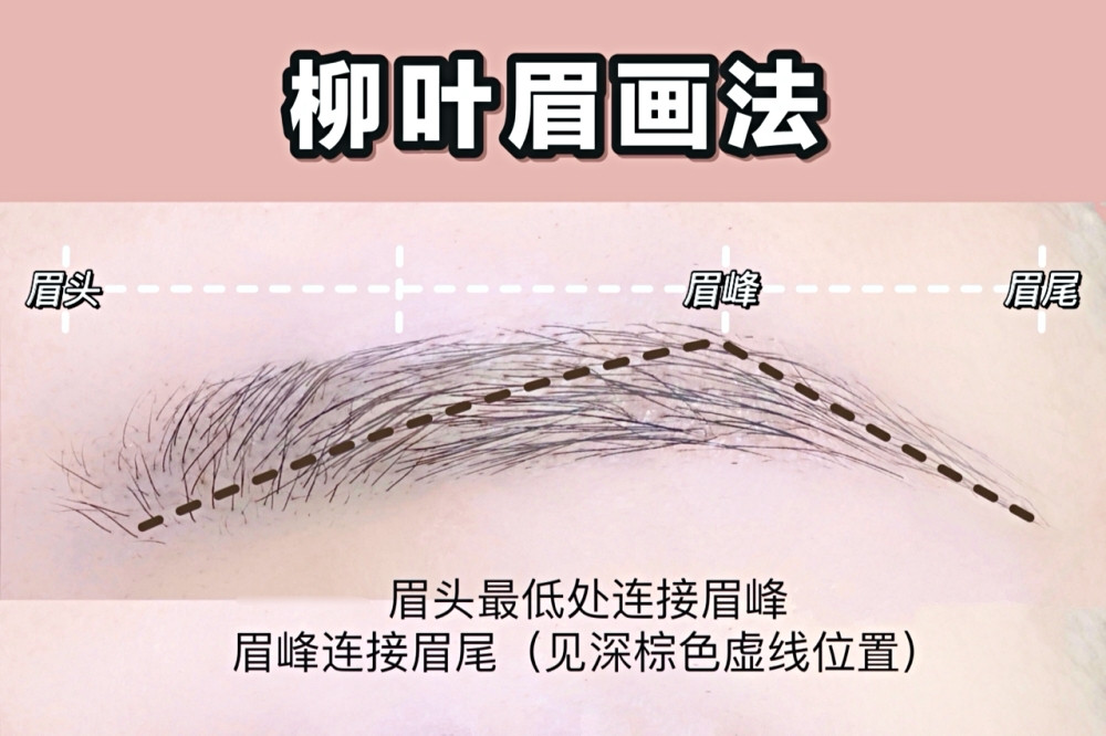 整體都用弧線去畫的柳葉眉,其實特別柔美,如果是臉部稜角感比較重的臉型其實很適合,會讓臉部輪廓更加柔和,柳葉眉重點走線在於眉頭下方最低處剛豪可以連接眉峰最高點,而眉峰則自然連接眉尾。