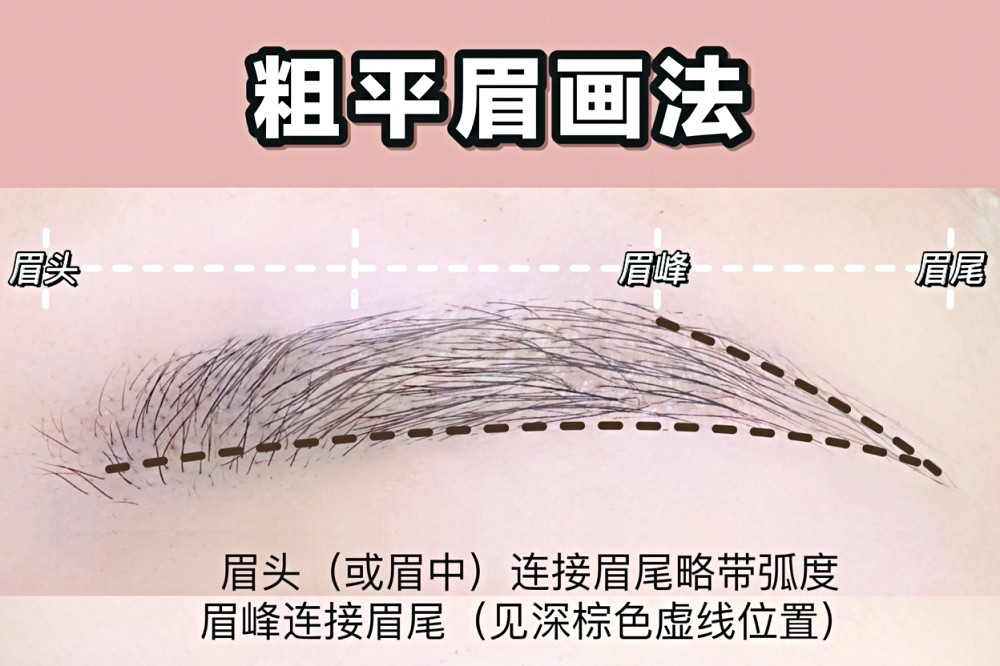 粗平眉其實不是真的要畫直直一條,畫的自然的話不但不突兀,還可以營造無辜、楚楚可憐的可愛感覺,另外粗平眉也特別適合長臉,可以修飾臉型,以平眉眉型來說眉頭下方大約與眉尾下方平行、略帶一點自然的弧度,而眉峰則自然的銜接眉尾。