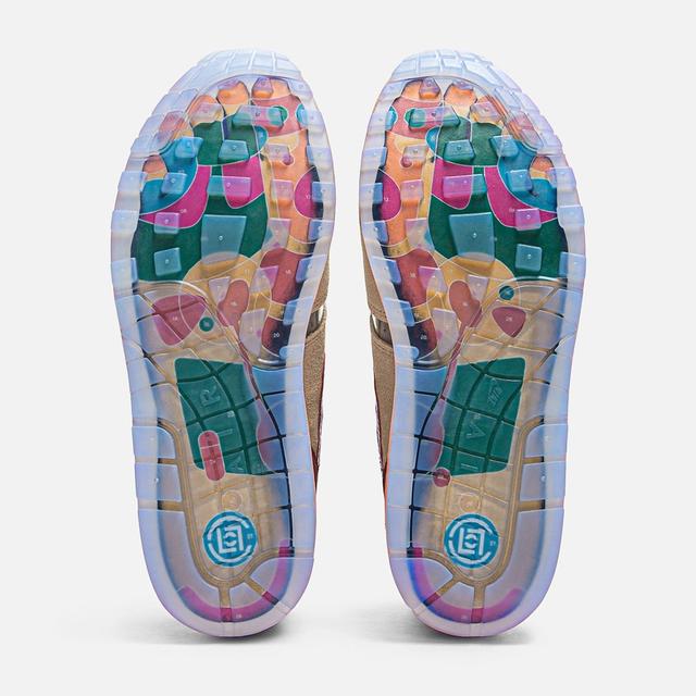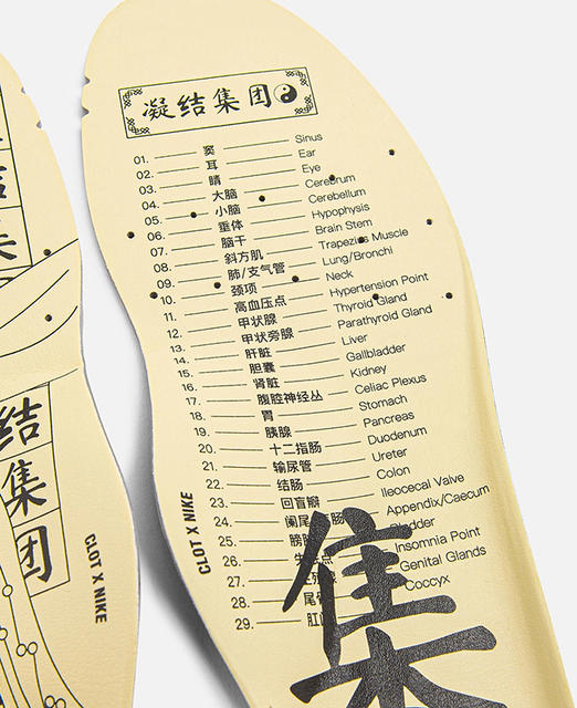 最後是鞋底部分,在帶點冰藍的果凍膠底裡,元年版本的圖案是一對腳掌,中心位置有一個紅點,全新復刻版則改為足部「穴道反射區」,並帶有CLOT經典商標,鮮豔的色塊讓你連抬腳都非常有看點!