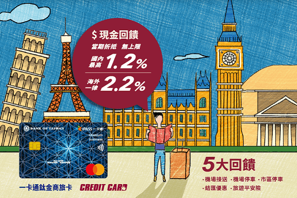 活動期間,新增並完成撥貸之臺灣銀行房貸戶,持有臺灣銀行一卡通鈦金商旅卡或一卡通導盲犬認同卡正卡,且申請電子帳單並辦理信用卡帳款自動轉帳扣繳,「國內一般消費」除享卡片原最高1.2%無上限之現金回饋外,另再加碼3%回饋,加碼回饋部份每人每月回饋上限新臺幣300元。