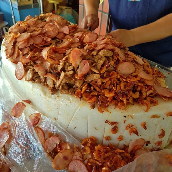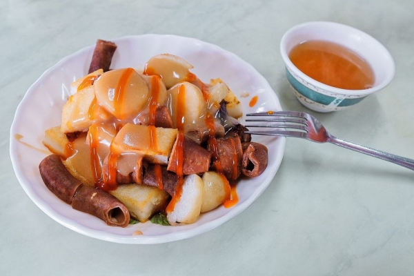 北港的特色早餐之一就是「煎盤粿」,以在來米跟水製成的米粿,煎至金黃起鍋後,再淋上甜米醬!這家位於北港朝天宮附近的「阿婆古早味煎盤粿」,在地已經營60多年,店內的煎盤粿都是自製,選用2年以上的舊在來米製成,加入豬油煎至金黃色起鍋,大推必點綜合,除了可以吃到招牌煎盤粿,還有滷腸、米腸及香腸,淋上特製的米醬及滷汁,盤粿吃起來口感軟嫩,還帶有股淡淡的米香,老闆更貼心準備柴魚湯免費供應,搭配著吃更爽口不膩。