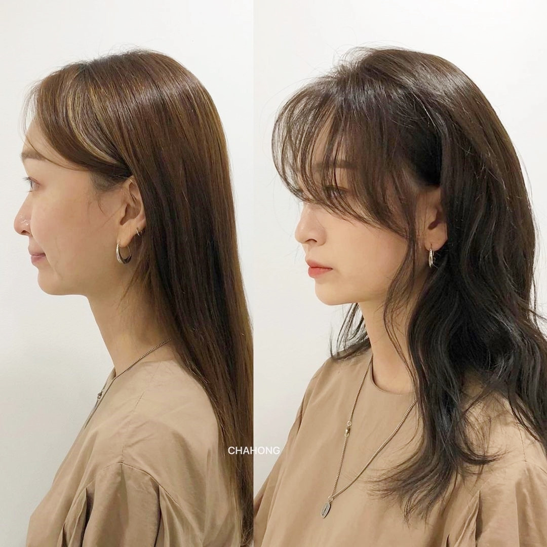 中庭(眉毛到鼻子)較長的臉型通常看起來比較成熟、老氣,選擇微捲的髮型會比直髮、或是大捲更顯年輕,想要砍氣來更加減齡的話,也推薦高一點的捲度,另外搭配可以依稀看到額頭的空氣瀏海、八字瀏海可以更加修飾臉型。
