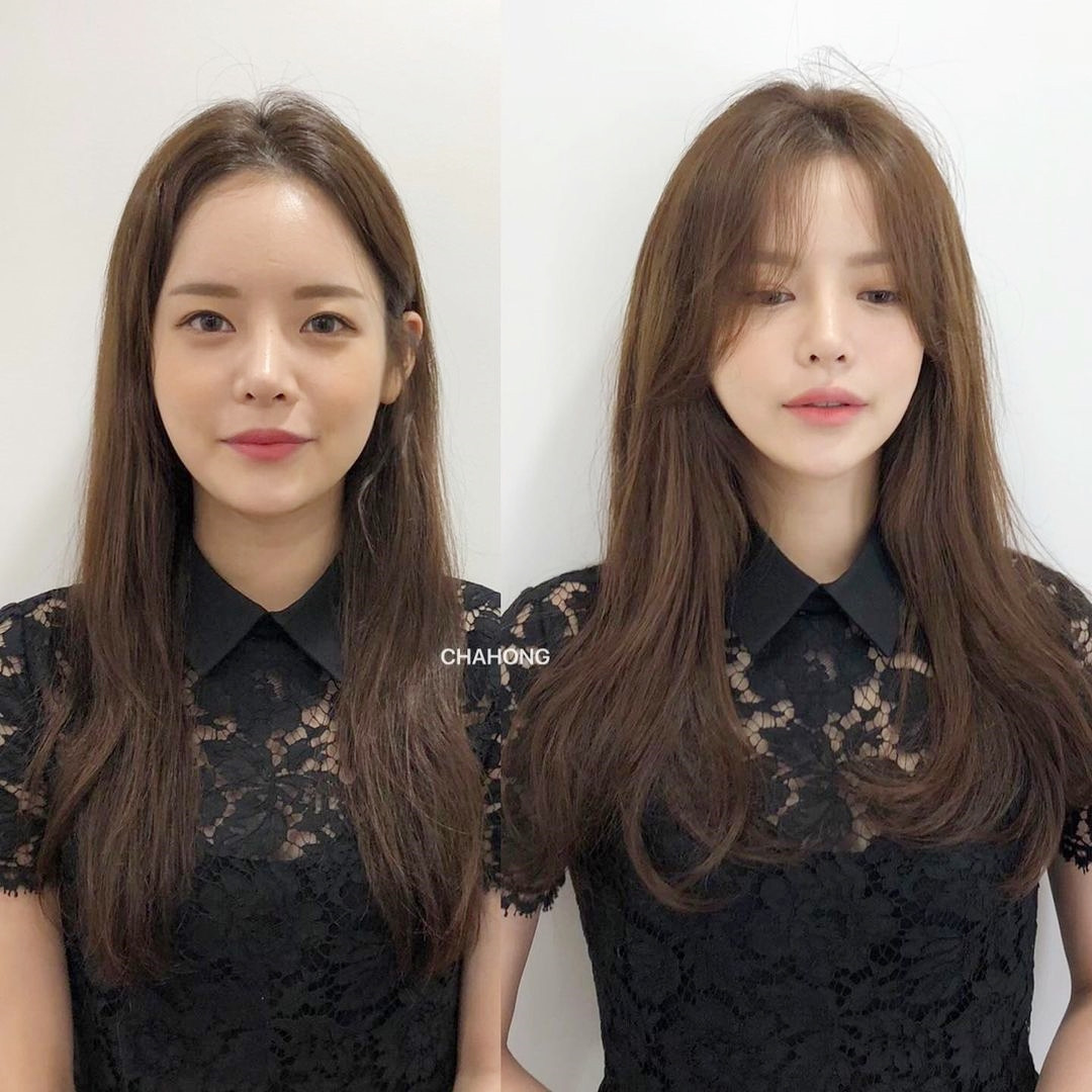 高額頭的臉型因為額頭比例比較高、容易讓五官往下集中,所以修飾額頭高度或寬度是重點,娃娃瀏海、一字瀏海這種可以蓋過額頭的瀏海就很推薦,在視覺上強調露出臉的下半部位,弱化上庭、讓整體臉型比例更加一致。
